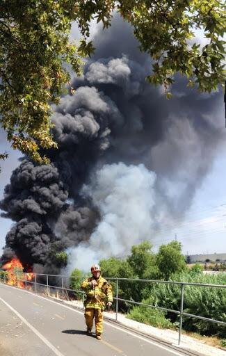 | Photo of fireman on L.A. River path as burning fuel pours into river Credit: Kevin Mulcahy http://www.theeastsiderla.com/?p=49956 |